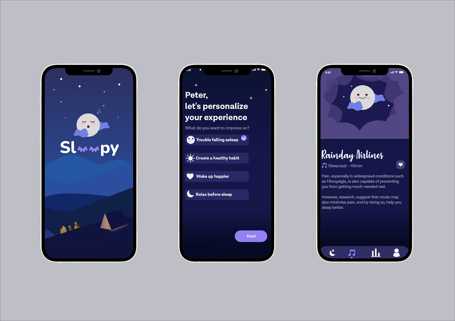 Sleepy is a user-friendly mobile application created to help individuals understand and improve their sleep quality. The app enables users to log their sleep times and quality, access personalised tips for better rest, and listen to soothing audio designed to make falling asleep easier. It also provides clear, easy-to-read visual charts that highlight sleep patterns and trends, helping users identify habits and track progress over time. By combining practical tools with a simple, intuitive interface, Sleepy empowers users to build healthier sleep routines and enhance their overall well-being.